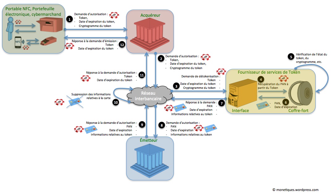 Une fois les données acquises par l'accepteur, une demande d'autorisation est envoyée  au Serveur d'Autorisation de la banque Acquéreur (SAA). L'acquéreur envoie l'autorisation sur le réseau qui l'achemine ensuite au Token Requestor. Ce dernier consulte son coffre-fort, afin de la "détokeniser". Ce processus inverse consiste à remplacer les données du token par celles de la véritable carte. Ainsi, les champs de la demande d'autorisation sont modifiés comme suit :