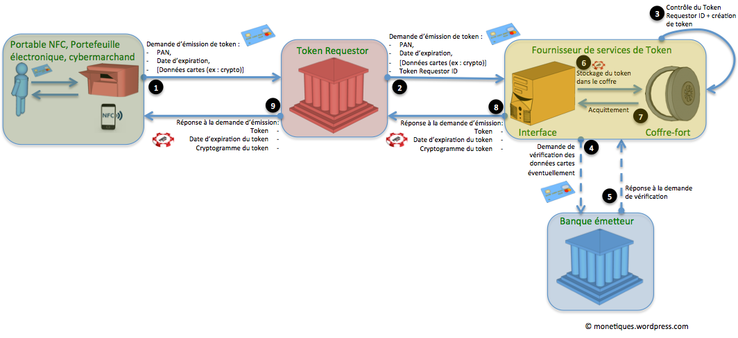 Lorsqu'il souhaite obtenir un token, le portefeuille électronique ou le portable NFC HCE demande au Token Requestor de réaliser une demande d'émission de tokens au fournisseur en lui communiquant au minimum :